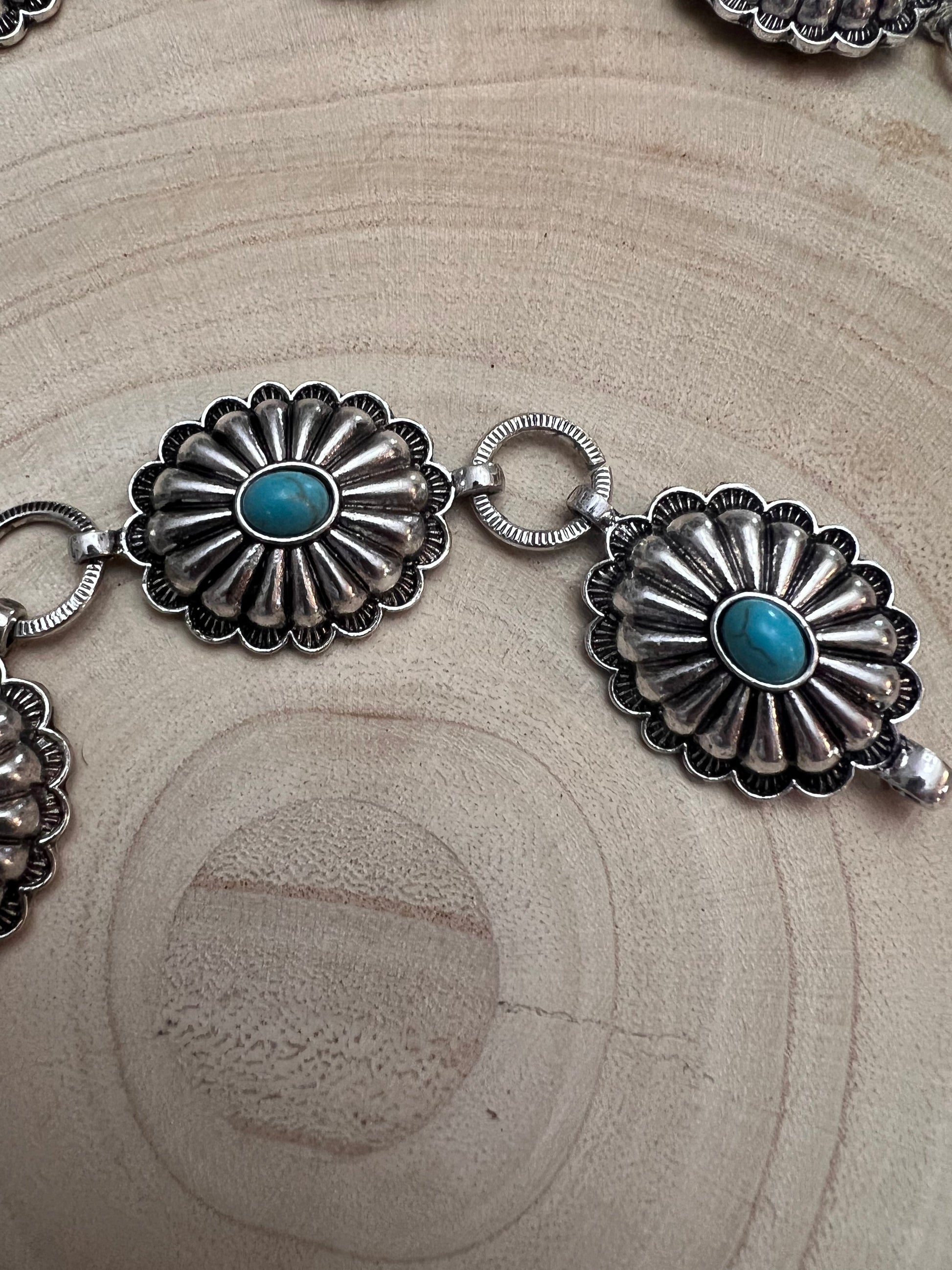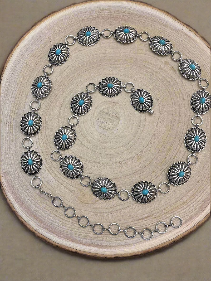 The Houston Small Concho Belt with faux turquoise accents has hooks to adjust the size, available in one size. It is size Small/Medium, but adjustable to fit your size. With this unique belt, you won't have to worry about finding the perfect fit! The Houston Small Concho Belt offers versatile sizing options with its adjustable hooks, ensuring a perfect fit for every waist (and your waist, specifically).